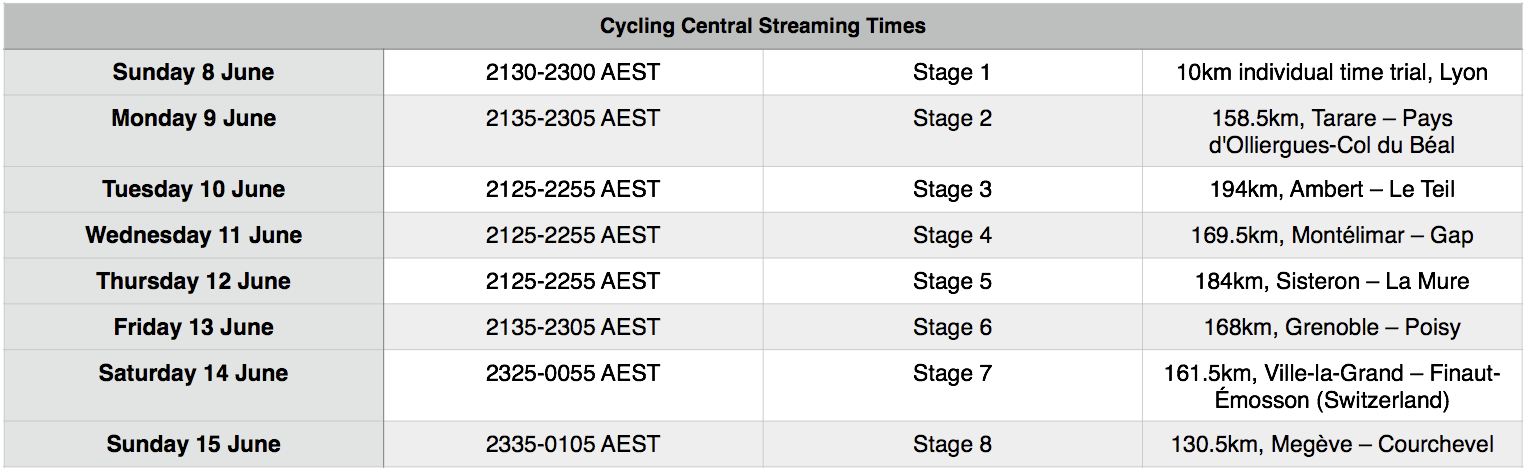 Streaming times for the Critérium du Dauphiné on Cycling Central are as follows: