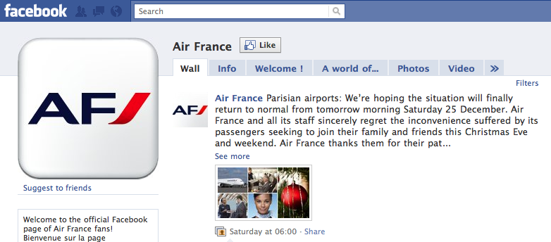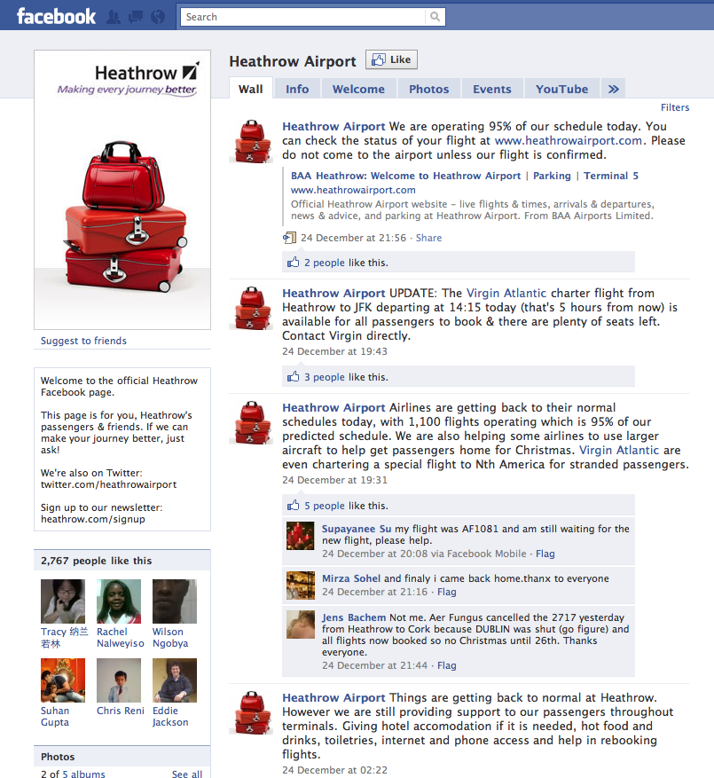 With over 500 million active users on Facebook it is no surprise that airlines such as Air France, American Airlines and United Airlines and airports such as Heathrow have turned to the social networking behemoth to try and quell the concern of frustrated passengers. These companies’ Facebook pages have become a key source where passengers can be informed and the companies can listen to any grievances passengers may have.